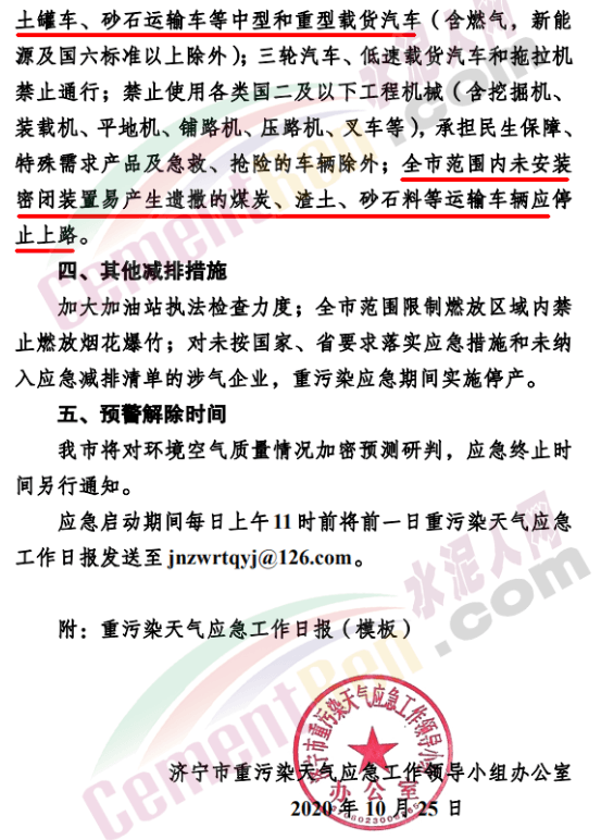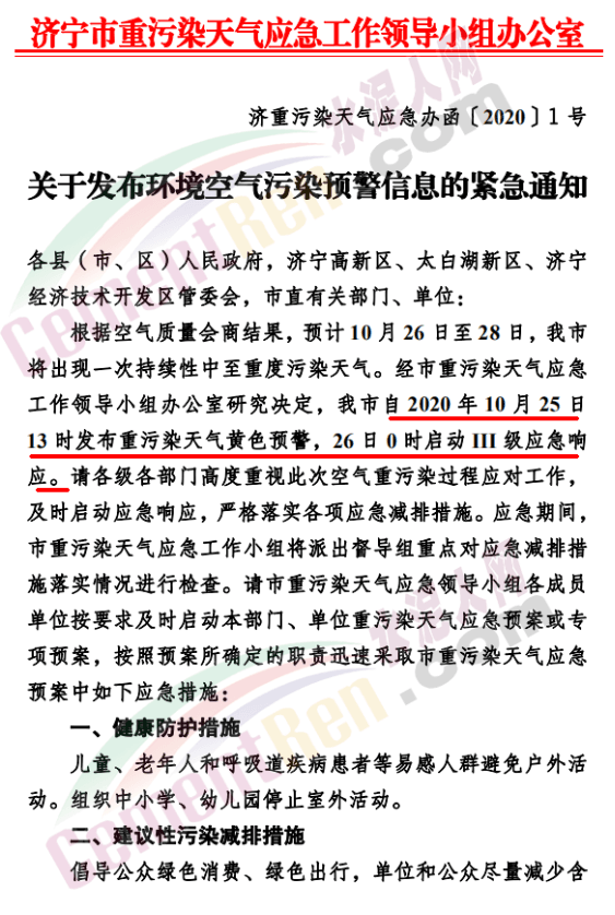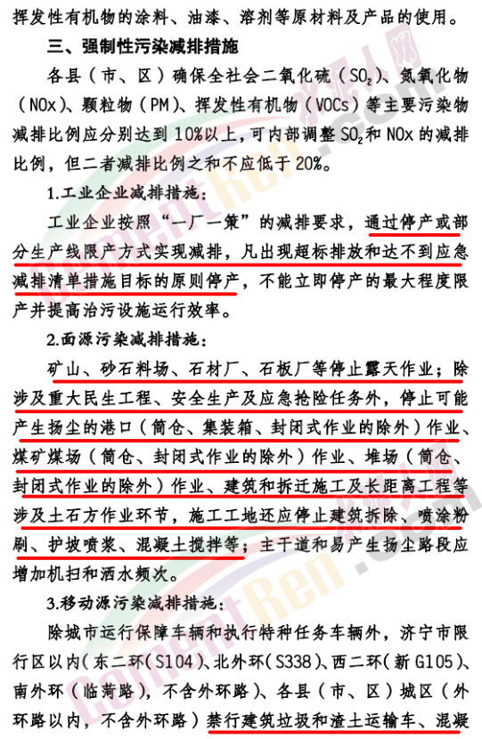 要求工業(yè)企業(yè)按照“一廠一策”的減排要求,通過停產(chǎn)或部分生產(chǎn)線限產(chǎn)方式實(shí)現(xiàn)減排,凡出現(xiàn)超標(biāo)排放和達(dá)不到應(yīng)急減排清單措施目標(biāo)的原則停產(chǎn),不能立即停產(chǎn)的最大程度限產(chǎn)并提高治污設(shè)施運(yùn)行效率。礦山、砂石料場(chǎng)、石材廠、石板廠等停止露天作業(yè);除涉及重大民生工程、安全生產(chǎn)及應(yīng)急搶險(xiǎn)任務(wù)外,停止可能產(chǎn)生揚(yáng)塵的港口作業(yè)、煤礦煤場(chǎng)作業(yè)、堆場(chǎng)作業(yè)、建筑和拆遷施工及長(zhǎng)距離工程等涉及土石方作業(yè)環(huán)節(jié),施工工地還應(yīng)停止建筑拆除、噴涂粉刷、護(hù)坡噴漿、混凝土攪拌等。除城市運(yùn)行保障車輛和執(zhí)行特種任務(wù)車輛外,濟(jì)寧市限行區(qū)以內(nèi)禁行建筑垃圾和渣土運(yùn)輸車、混凝土罐車、砂石運(yùn)輸車等中型和重型載貨汽車。全市范圍內(nèi)未安裝密閉裝置易產(chǎn)生遺撒的煤炭、渣土、砂石料等運(yùn)輸車輛應(yīng)停止上路。對(duì)未按國(guó)家、省要求落實(shí)應(yīng)急措施和未納入應(yīng)急減排清單的涉氣企業(yè),重污染應(yīng)急期間實(shí)施停產(chǎn)。通知原文如下: