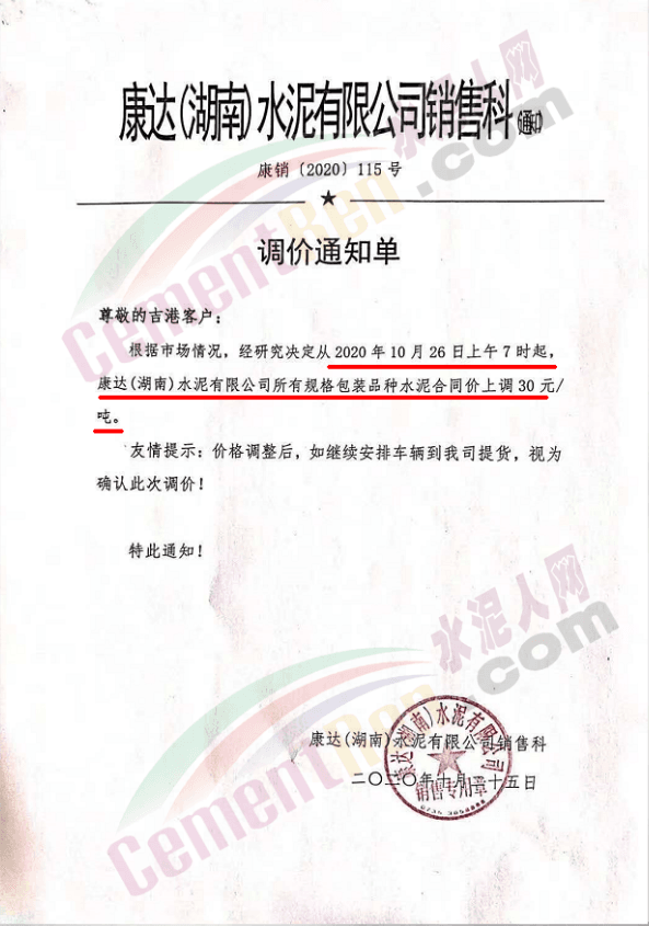 紅獅水泥旗下康達(dá)(湖南)水泥有限公司銷售科通知,自今日(10月26日)上午7時(shí)起,所有規(guī)格包裝品種水泥合同價(jià)上調(diào)30元/噸。