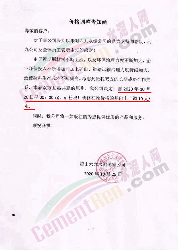 唐山六九水泥銷售公司通知,由于近期原材料不斷上漲,環(huán)保治理力度不斷加大,企業(yè)環(huán)保投入不斷增加,加上礦山、道路運(yùn)輸治理力度持續(xù)加大,致使熟料生產(chǎn)成本不斷提高。自2020年10月26日0時(shí)起,礦粉出廠價(jià)格在原價(jià)格的基礎(chǔ)上上調(diào)10元/噸。
