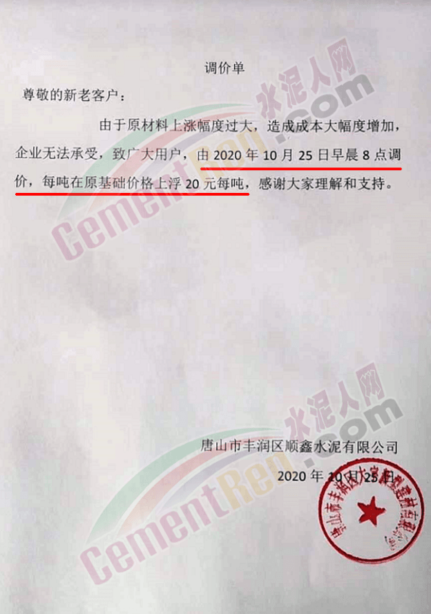 唐山市豐潤(rùn)區(qū)順鑫水泥有限公司通知,由于原材料上漲幅度過大,造成成本大幅度增加,企業(yè)無法承受。自10月25日早8點(diǎn)起,水泥價(jià)格上浮20元/噸。