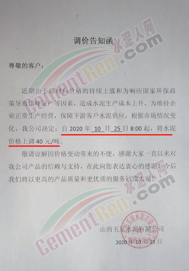 山西五星水泥通知,由于原材料價(jià)格的持續(xù)上漲和為響應(yīng)國(guó)家環(huán)保政策導(dǎo)致錯(cuò)峰限產(chǎn)等因素,造成水泥生產(chǎn)成本上升,為維持企業(yè)正常生產(chǎn)經(jīng)營(yíng),保障下游客戶水泥供應(yīng),根據(jù)市場(chǎng)情況變化,公司決定自10月25日8時(shí)起將水泥價(jià)格上調(diào)40元/噸。