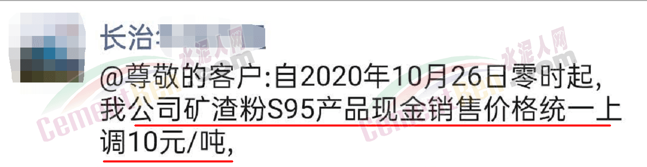 山西長(zhǎng)治建材經(jīng)銷商通知,自今日(10月26日)零時(shí)起公司礦渣粉S95產(chǎn)品現(xiàn)金銷售價(jià)格統(tǒng)一上調(diào)10元/噸。