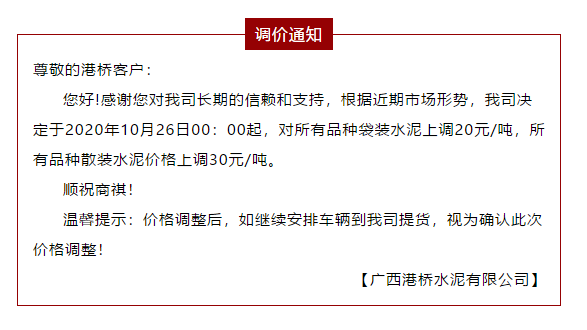 廣西港橋水泥有限公司通知,根據(jù)近期市場(chǎng)形勢(shì),決定于2020年10月26日0時(shí)起,對(duì)所有品種袋裝水泥上調(diào)20元/噸,所有品種散裝水泥價(jià)格上調(diào)30元/噸。