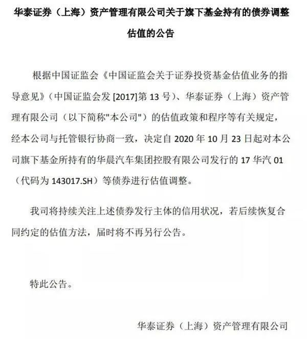 華泰證券資管稱公告稱,公司決定自 2020 年 10 月 23 日起對旗下基金所持有的華晨汽車集團控股有限公司發(fā)行的 17 華汽 01(代碼為 143017.SH)等債券進行估值調(diào)整。