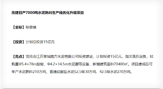 其中,江蘇宜城南方水泥有限公司投資建設(shè)改建日產(chǎn)7000噸水泥熟料生產(chǎn)線優(yōu)化升級(jí)項(xiàng)目在列。