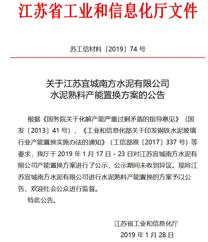 據(jù)水泥人網(wǎng)了解,今年1月末,江蘇工信廳發(fā)布《關(guān)于江蘇宜城南方水泥有限公司水泥熟料產(chǎn)能置換方案的公告》稱根據(jù)相關(guān)文件要求,于2019年1月17日-23日對(duì)江蘇宜城南方水泥有限公司產(chǎn)能置換方案進(jìn)行了公示,公示期間未收到異議。并將江蘇宜城南方水泥有限公司進(jìn)行水泥熟料產(chǎn)能置換的方案予以公告。
