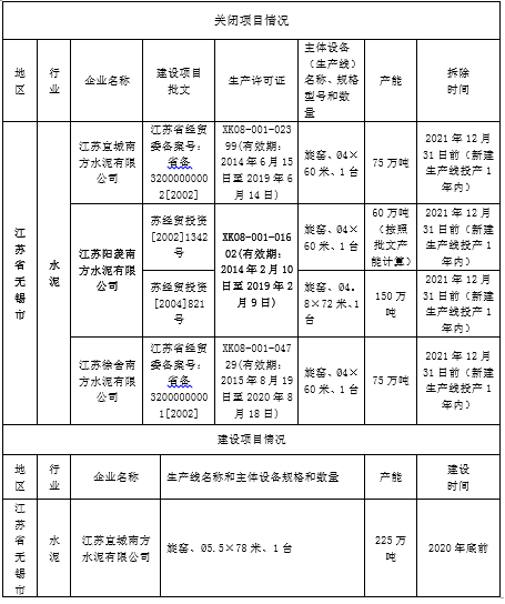 公告內(nèi)容顯示,建設(shè)項(xiàng)目為一條年產(chǎn)225萬(wàn)噸的熟料生產(chǎn)線,回轉(zhuǎn)窯直徑為5.5×78米,建設(shè)時(shí)間為2020年底前。關(guān)閉退出項(xiàng)目為江蘇陽(yáng)羨南方水泥有限公司210萬(wàn)噸生產(chǎn)線、江蘇徐舍南方水泥有限公司75萬(wàn)噸生產(chǎn)線和江蘇宜城南方水泥有限公司原有75萬(wàn)噸生產(chǎn)線,退出時(shí)間為2021年12月31日前,即新建生產(chǎn)線投產(chǎn)一年內(nèi)。