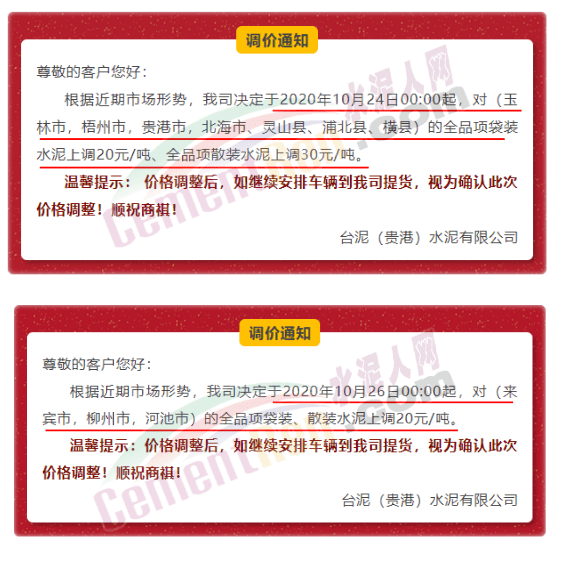 臺泥(貴港)水泥有限公司通知于2020年10月24日00:00起,對(玉林市,梧州市,貴港市,北海市、靈山縣、浦北縣、橫縣)的全品項袋裝水泥上調20元/噸、全品項散裝水泥上調30元/噸;于2020年10月26日00:00起,對(來賓市,柳州市,河池市)的全品項袋裝、散裝水泥上調20元/噸。
