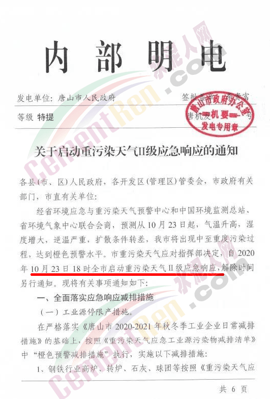 日前,唐山市人民政府發(fā)布特提等級文件《關(guān)于啟動重污染天氣II級應(yīng)急響應(yīng)的通知》稱,自2020年10月23日18時全市啟動重污染天氣II級應(yīng)急響應(yīng),解除時間另行通知。工業(yè)源停限產(chǎn)措施,要求在嚴(yán)格落實《唐山市2020-2021年秋冬季工業(yè)企業(yè)日常減排措施》的基礎(chǔ)上,按照《重污染天氣應(yīng)急工業(yè)源污染物減排清單》中“橙色預(yù)警減排措施”執(zhí)行。水泥行業(yè)B級企業(yè)限產(chǎn)比例不低于20%;C級企業(yè)停產(chǎn);協(xié)同處置城市生活垃圾、污泥或危險廢物的企業(yè)按照最低負(fù)荷進行生產(chǎn)。非引領(lǐng)性水泥粉磨站、礦渣粉企業(yè)停產(chǎn)、停止運輸。施工工地、工業(yè)企業(yè)廠區(qū)和工業(yè)園區(qū)內(nèi)停止使用國二及以下排放標(biāo)準(zhǔn)非道路移動機械(清潔能源和緊急檢修作業(yè)機械除外)。 全市除滿足“六個百分百”“兩個全覆蓋”的省市重點工程、保障民生工程和應(yīng)急搶險工程,停止建筑垃圾和渣土運輸。礦山、洗煤廠、港口、物流(除民生保障類)等涉及大宗原料和產(chǎn)品運輸(日常車輛進出量超過10輛)的單位禁止使用國四及以下重型載貨汽車(含燃?xì)?進行運輸(特種車輛、危險化學(xué)品車輛等除外)。工業(yè)企業(yè)移動源限行措施執(zhí)行《關(guān)于印送〈重污染天氣重點行業(yè)應(yīng)急減排措施制定技術(shù)指南(2020年修訂版)〉的函》(環(huán)辦大氣函〔2020〕340號)相關(guān)條款。10月24日20時至26日8時港口集疏運車輛禁止進出港區(qū),運輸民生保障物資或特殊需求產(chǎn)品、以及為外貿(mào)貨物、進出境旅客提供港口集輸運服務(wù)的國V及以上排放標(biāo)準(zhǔn)的車輛除外。礦山、沙石料廠、石材廠、石板廠等停止露天作業(yè);施工工地停止土石方作業(yè)、建筑拆除、噴涂粉刷、護坡噴漿、混凝土攪拌等;未安裝密閉裝置易產(chǎn)生遺撒的煤炭、渣土、砂石料等運輸車輛停止上路。各縣(市、區(qū))政府、開發(fā)區(qū)(管理區(qū))管委會充分應(yīng)用企業(yè)在線、現(xiàn)頻監(jiān)控、門票系統(tǒng)和無人機等手段加強督導(dǎo)檢查,確保各項管控要求落實到位。市直有關(guān)部門要爼成督查組對全市應(yīng)急響應(yīng)措施落實情況開展全面督查,對發(fā)現(xiàn)問題立即督辦整改。各級各部門對不按要求落實應(yīng)急響應(yīng)措施的行為要按照《唐山市大氣污染防治若干規(guī)定》依法查處,嚴(yán)格做到“處罰、移交、行拘、問責(zé)、曝光”五個到位。文件原文如下: