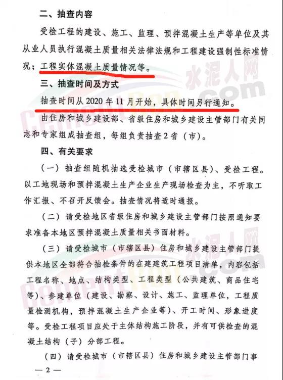一、抽查范圍及對(duì)象:天津、河北、安徽、江西、山東、河南、湖南、海南、重慶、貴州等10省(市),每省抽查1個(gè)地級(jí)以上城市,直轄市抽查2~3個(gè)市轄區(qū)(縣)。每省(市)抽查3個(gè)使用預(yù)拌混凝土的在建建筑工程項(xiàng)目以及相關(guān)預(yù)拌混凝土生產(chǎn)企業(yè)。二、抽查內(nèi)容:受檢工程的建設(shè)、施工、監(jiān)理、預(yù)拌混凝土生產(chǎn)等單位及其從業(yè)人員執(zhí)行混凝土質(zhì)量相關(guān)法律法規(guī)和工程建設(shè)強(qiáng)制性標(biāo)準(zhǔn)情況;工程實(shí)體混凝土質(zhì)量情況等。三、抽查時(shí)間:抽時(shí)間從2020年11月開(kāi)始,具體時(shí)間另行通知。通知全文如下: