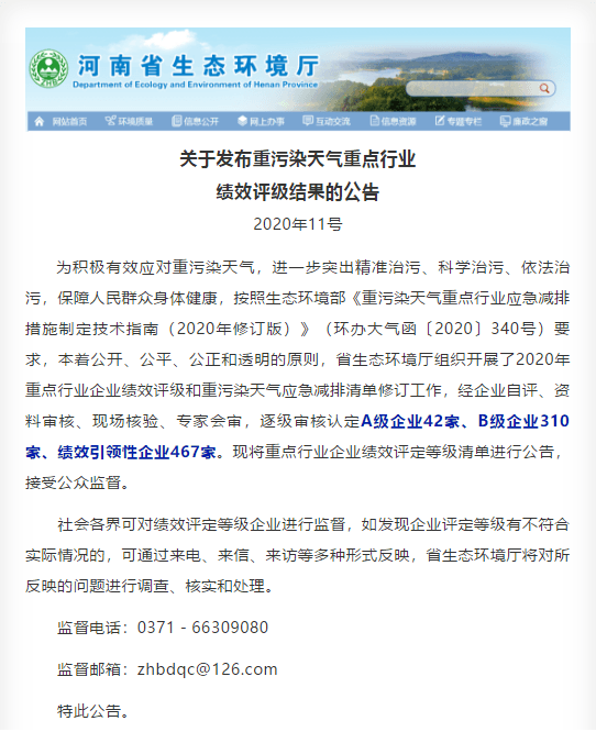 日前,河南省生態(tài)環(huán)境廳發(fā)布《關(guān)于發(fā)布重污染天氣重點(diǎn)行業(yè)績(jī)效評(píng)級(jí)結(jié)果的公告》稱(chēng),為積極有效應(yīng)對(duì)重污染天氣,進(jìn)一步突出精準(zhǔn)治污、科學(xué)治污、依法治污,保障人民群眾身體健康,按照生態(tài)環(huán)境部《重污染天氣重點(diǎn)行業(yè)應(yīng)急減排措施制定技術(shù)指南(2020年修訂版)》(環(huán)辦大氣函〔2020〕340號(hào))要求,本著公開(kāi)、公平、公正和透明的原則,河南省生態(tài)環(huán)境廳組織開(kāi)展了2020年重點(diǎn)行業(yè)企業(yè)績(jī)效評(píng)級(jí)和重污染天氣應(yīng)急減排清單修訂工作,經(jīng)企業(yè)自評(píng)、資料審核、現(xiàn)場(chǎng)核驗(yàn)、專(zhuān)家會(huì)審,逐級(jí)審核認(rèn)定A級(jí)企業(yè)42家、B級(jí)企業(yè)310家、績(jī)效引領(lǐng)性企業(yè)467家。