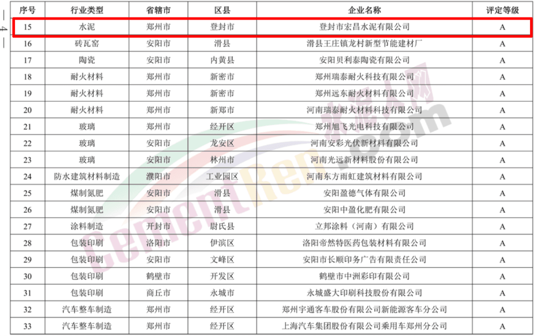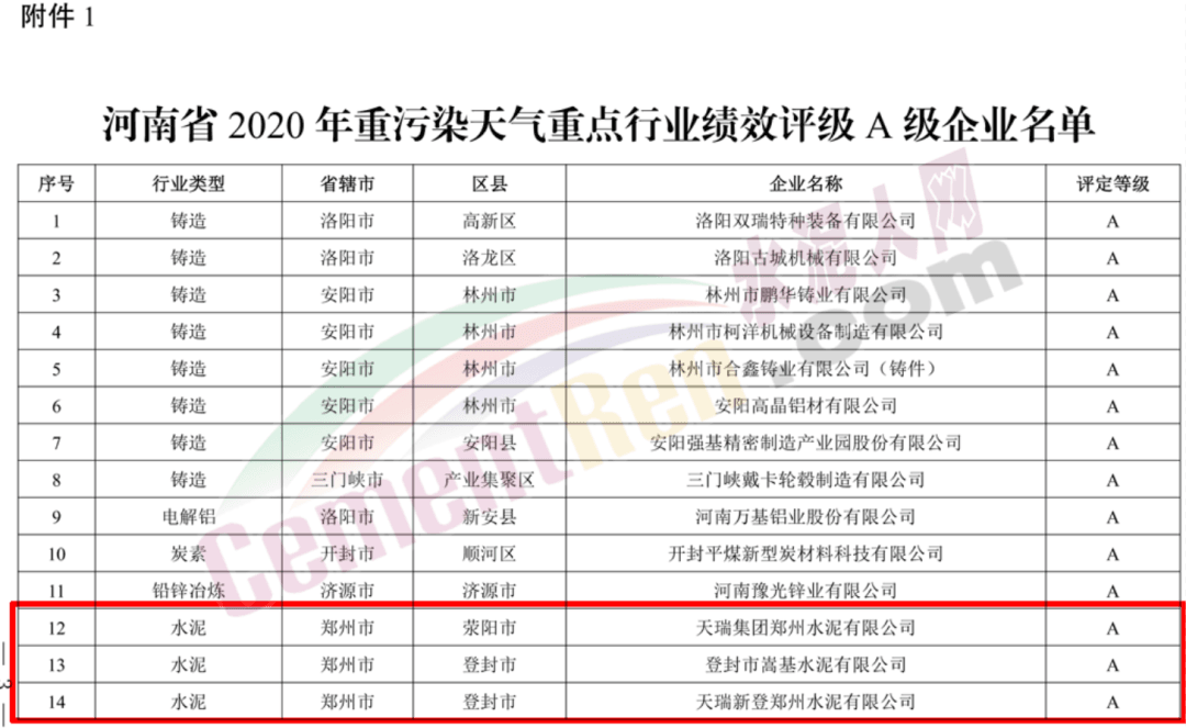 其中鄭州登封市四家水泥企業(yè)獲評(píng)A級(jí)企業(yè),分別為天瑞集團(tuán)鄭州水泥有限公司、登封市嵩基水泥有限公司、天瑞新登鄭州水泥有限公司、登封市宏昌水泥有限公司。