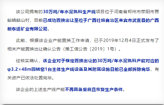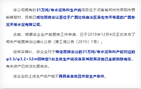 一、關(guān)于河南隆鑫水泥有限責(zé)任公司年產(chǎn)31萬噸水泥熟料已置換產(chǎn)能拆除退出情況。該公司擁有的31萬噸/年水泥熟料生產(chǎn)線項目位于河南省鄭州市滎陽市賈峪鎮(zhèn)楚村,目前已成功置換出讓至位于廣西壯族自治區(qū)崇左市天等縣的廣西東泥天等水泥有限公司。此前,根據(jù)該企業(yè)產(chǎn)能置換工作申請,我廳已于2019年12月4日正式發(fā)布了相關(guān)產(chǎn)能置換出讓確認(rèn)公告(豫工信公告〔2019〕1號)。經(jīng)我廳核實確認(rèn),該企業(yè)對于核定置換出讓的31萬噸/年水泥熟料產(chǎn)能對應(yīng)的φ3.5/φ3.2×52m回轉(zhuǎn)窯1臺主體生產(chǎn)線設(shè)備及其附屬設(shè)施已全部拆除完畢,有關(guān)資產(chǎn)已依法處置完畢。該企業(yè)的上述生產(chǎn)線產(chǎn)能不再具備重啟且恢復(fù)生產(chǎn)條件。