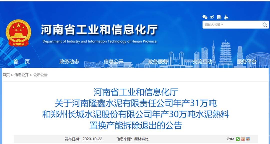 根據(jù)《工業(yè)和信息化部關(guān)于印發(fā)鋼鐵水泥玻璃行業(yè)產(chǎn)能置換實施辦法的通知》(工信部原〔2017〕337號)、工業(yè)和信息化部網(wǎng)站發(fā)布的《水泥玻璃行業(yè)產(chǎn)能置換實施辦法操作問答》有關(guān)工作程序規(guī)定和要求,現(xiàn)將河南隆鑫水泥有限責(zé)任公司31萬噸/年水泥熟料已置換產(chǎn)能生產(chǎn)線、鄭州長城水泥股份有限公司30萬噸/年水泥熟料已置換產(chǎn)能生產(chǎn)線的拆除退出情況公告如下,歡迎社會公眾進行監(jiān)督。