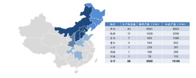 產能主要布局在京津冀、陜西、山西、內蒙、東北、重慶、山東、河南和湖南地區(qū), 共計 13 個省/直轄市, 其中華北區(qū)域為公司產能主要區(qū)域,熟料產能占公司整體產能的 64%, 其中核心區(qū)域京津冀地區(qū)占總體比重約 46%,其次為陜西和東北區(qū)域,分別占比為 15%和 10%。