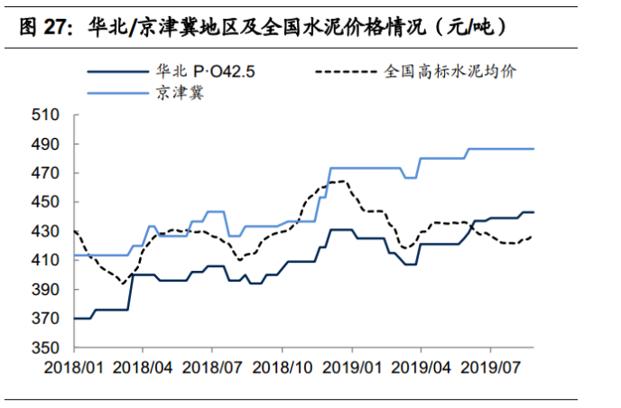 由于今年需求的增加,截至 8 月 30 日,華北地區(qū)和京津冀地區(qū)高標水泥分別報價 443 元/噸和 487 元/噸, 同比上漲 10.86%和 14.06%,處于歷史同期高位水平。