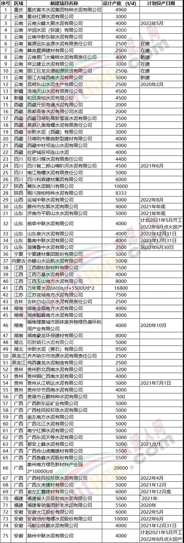 在75條熟料生產線1.1億噸產能中,廣西區(qū)域2475萬噸/年,云南1110萬噸/年,江西909萬噸/年,湖南747萬噸/年、西藏720萬噸/年,詳情如下: