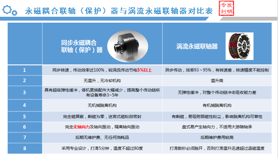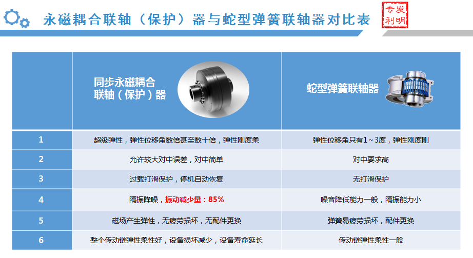 作為國內(nèi)專業(yè)生產(chǎn)耦合器的企業(yè),江蘇磁谷自主研發(fā)生產(chǎn)的永磁耦合聯(lián)軸(保護(hù))器采用雙永磁筒式結(jié)構(gòu),利用稀土永磁純物理吸力(無電磁感應(yīng))產(chǎn)生大彈性位移,同步傳遞轉(zhuǎn)矩,廣泛應(yīng)用于水泥、電力、鋼鐵、礦山、煤炭等行業(yè)提升機(jī)、斜拉鏈機(jī)、皮帶機(jī)、斗輪機(jī)、風(fēng)機(jī)、水泵等動力系統(tǒng),取代限矩型液偶、蛇形彈簧聯(lián)軸器等沖擊大、振動大的剛性聯(lián)軸器及渦流永磁聯(lián)軸器。