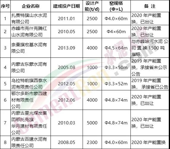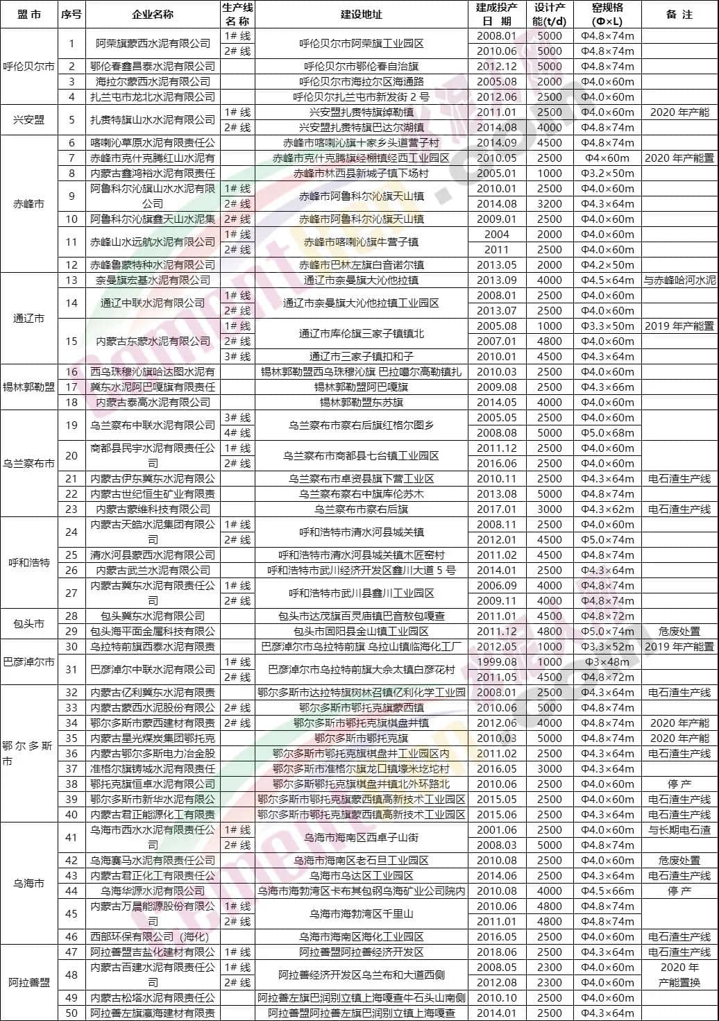 內(nèi)蒙古自治區(qū)水泥熟料生產(chǎn)線清單