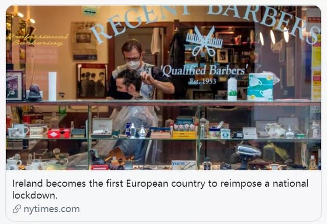 愛爾蘭總理米歇爾·馬丁20日宣布,自10月22日起再度全國“封城”6周,直到12月初。非必要經(jīng)營場所一律關閉,超市、藥房、郵局和銀行等不受影響。餐館、咖啡館和酒吧僅限外賣服務。民眾外出活動范圍僅限住所5公里范圍內(nèi)。