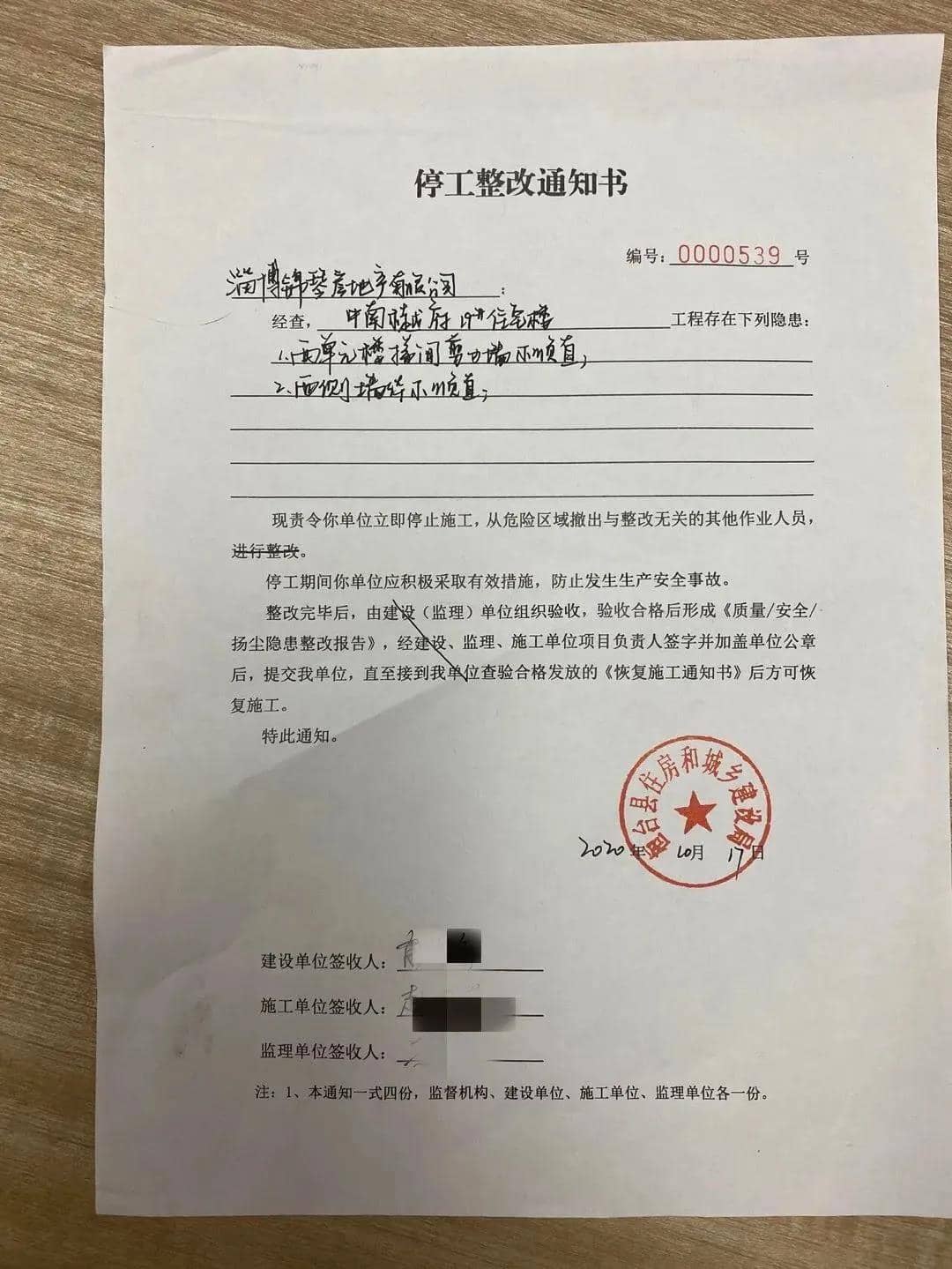 10月17日,因“兩單元樓梯間剪力墻以及兩側(cè)墻體不順直”,桓臺縣住房和城鄉(xiāng)建設(shè)局對淄博錦琴房地產(chǎn)有限公司下達(dá)停工整改通知書,責(zé)令立即停止施工,從危險(xiǎn)區(qū)域撤出與整改無關(guān)的其他作業(yè)人員。