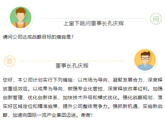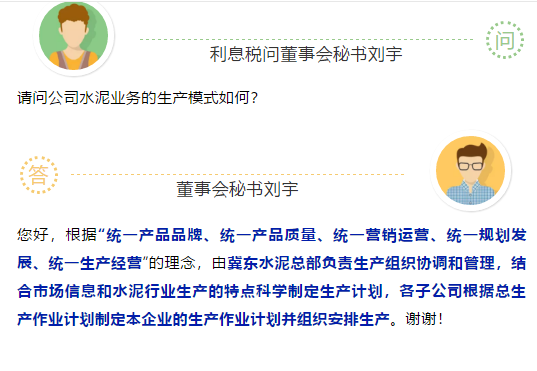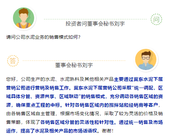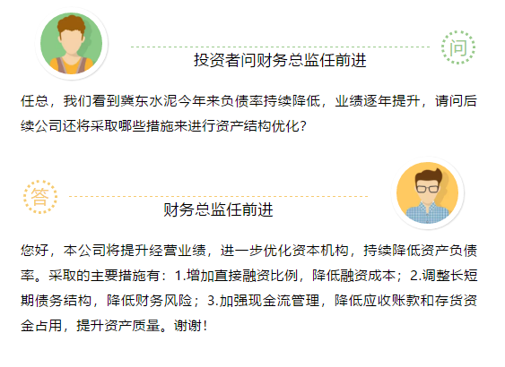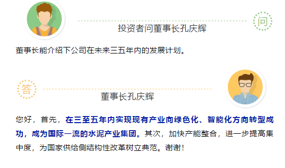 5.成本優(yōu)勢:公司持續(xù)做實(shí)做優(yōu)生產(chǎn)運(yùn)營管控,為實(shí)現(xiàn)高質(zhì)量發(fā)展,持續(xù)推進(jìn)“培優(yōu)”工作,以培優(yōu)為平臺的對標(biāo)、總結(jié)、互相借鑒、 學(xué)習(xí),營造了標(biāo)桿引領(lǐng)、爭先創(chuàng)優(yōu)的地良好企業(yè)發(fā)展氛圍;持續(xù)加大技改投入,以篦冷機(jī)、預(yù)熱器、預(yù)粉磨設(shè)備等主機(jī)提效 為重點(diǎn)加速消除落后工藝、低效裝備;引進(jìn)、推廣成熟、有效的節(jié)能降耗技術(shù)措施,降耗能力提升;持續(xù)推進(jìn)直供電工作, 成本控降效果顯著;結(jié)合各區(qū)域產(chǎn)品質(zhì)量的差異化需求,按區(qū)域制定質(zhì)量標(biāo)準(zhǔn),著力解決水泥產(chǎn)品面臨的同質(zhì)化、低附加值 等重大共性問題,開發(fā)適應(yīng)市場的高性能定制化水泥。使得公司在布局區(qū)域的成本競爭優(yōu)勢明顯,為公司產(chǎn)能釋放、效益提升奠定了基礎(chǔ)。6.人才優(yōu)勢:公司堅(jiān)持實(shí)施“人才強(qiáng)企”戰(zhàn)略,培養(yǎng)造就了一批綜合素質(zhì)好的優(yōu)秀經(jīng)營管理人才和素質(zhì)一流的高級專業(yè)技術(shù)人才隊(duì)伍, 建設(shè)了一支符合公司發(fā)展需要的優(yōu)秀年輕骨干人才梯隊(duì);通過引進(jìn)科技領(lǐng)軍人才、高級技術(shù)專家等高端優(yōu)秀人才,匯聚高端智力資源,充分發(fā)揮高層次人才在推動公司發(fā)展的引領(lǐng)作用。報(bào)告期,公司人才結(jié)構(gòu)持續(xù)優(yōu)化、布局更加合理,一批職業(yè)素 養(yǎng)好、開拓能力強(qiáng)的經(jīng)營管理人員成為公司人才競爭的比較優(yōu)勢。謝謝!