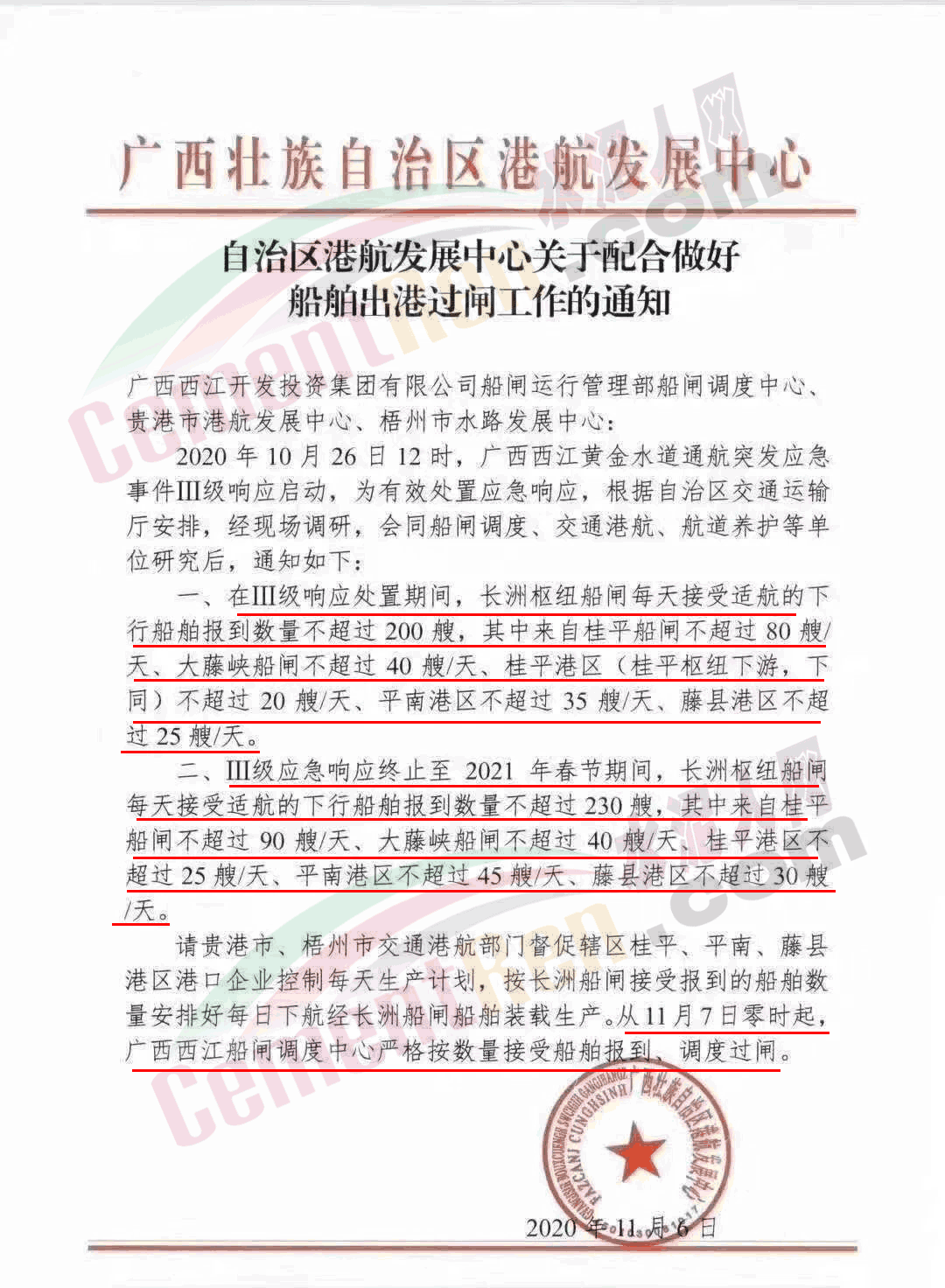 日前,廣西壯族自治區(qū)港航發(fā)展中心發(fā)布《自治區(qū)港航發(fā)展中心關(guān)于配合做好船舶出港過閘工作的通知》稱,2020年10月26日12時(shí),廣西西江黃金水道通航突發(fā)應(yīng)急事件Ⅲ級(jí)響應(yīng)啟動(dòng),為有效處置應(yīng)急響應(yīng),根據(jù)自治區(qū)交通運(yùn)輸廳安排,經(jīng)現(xiàn)場(chǎng)調(diào)研,會(huì)同船閘調(diào)度、交通港航、航道養(yǎng)護(hù)等單位研究后,要求在Ⅲ級(jí)響應(yīng)處置期間,長(zhǎng)洲樞紐船閘每天接受適航的下行船舶報(bào)到數(shù)量不超過200艘,其中來自桂平船閘不超過80艘/天、大藤峽船閘不超過40艘/天、桂平港區(qū)(桂平樞紐下游,下同)不超過 20艘/天、平南港區(qū)不超過35艘/天、藤縣港區(qū)不超過25艘/天。二、Ⅲ級(jí)應(yīng)急響應(yīng)終止至 2021年春節(jié)期間,長(zhǎng)洲樞紐船閘每天接受適航的下行船舶報(bào)到數(shù)量不超過230艘,其中來自桂平船閘不超過 90艘/天、大藤峽船閘不超過40艘/天、桂平港區(qū)不超過25艘/天、平南港區(qū)不超過45艘/天、藤縣港區(qū)不超過30艘/天。請(qǐng)貴港市、梧州市交通港航部門督促轄區(qū)桂平、平南、藤縣港區(qū)港口企業(yè)控制每天生產(chǎn)計(jì)劃,按長(zhǎng)洲船閘接受報(bào)到的船舶數(shù)量安排好每日下航經(jīng)長(zhǎng)洲船閘船舶裝載生產(chǎn)。從11月7日零時(shí)起,廣西西江船閘調(diào)度中心嚴(yán)格按數(shù)量接受船舶報(bào)到、調(diào)度過閘。