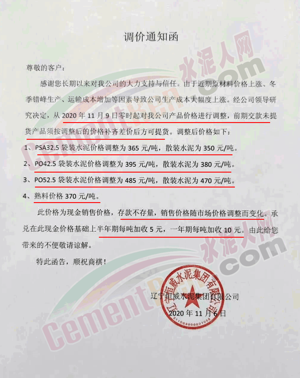 遼寧恒威水泥集團(tuán)調(diào)價(jià)通知稱,由于近期原材料價(jià)格上漲、冬季錯(cuò)峰生產(chǎn)、運(yùn)輸成本增加等因素導(dǎo)致公司生產(chǎn)成本大幅度上漲。經(jīng)公司領(lǐng)導(dǎo)研究決定,從2020年11月9日零時(shí)起對(duì)公司產(chǎn)品價(jià)格進(jìn)行調(diào)整,前期交款未提貨產(chǎn)品須按調(diào)整后的價(jià)格補(bǔ)齊差價(jià)后方可提貨。調(diào)整后價(jià)格如下∶1、PSA32.5袋裝水泥價(jià)格調(diào)整為365元/噸,散裝水泥為350元/噸。2、PO42.5袋裝水泥價(jià)格調(diào)整為395元/噸,散裝水泥為380元/噸。3、PO52.5袋裝水泥價(jià)格調(diào)整為485元/噸,散裝水泥為470元/噸。4、熟料價(jià)格370元/噸。此價(jià)格為現(xiàn)金銷售價(jià)格,存款不存量,銷售價(jià)格隨市場(chǎng)價(jià)格調(diào)整而變化。承兌在此現(xiàn)金價(jià)格基礎(chǔ)上半年期每噸加收5元,一年期每噸加收10元。