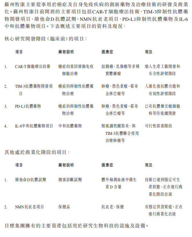 目標集團(目標公司及蘇州恒康)擁有的主要資產(chǎn)包括用于研究生物科技的設施及設備。