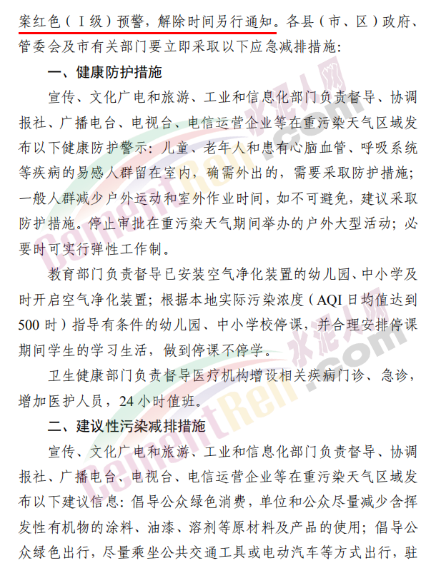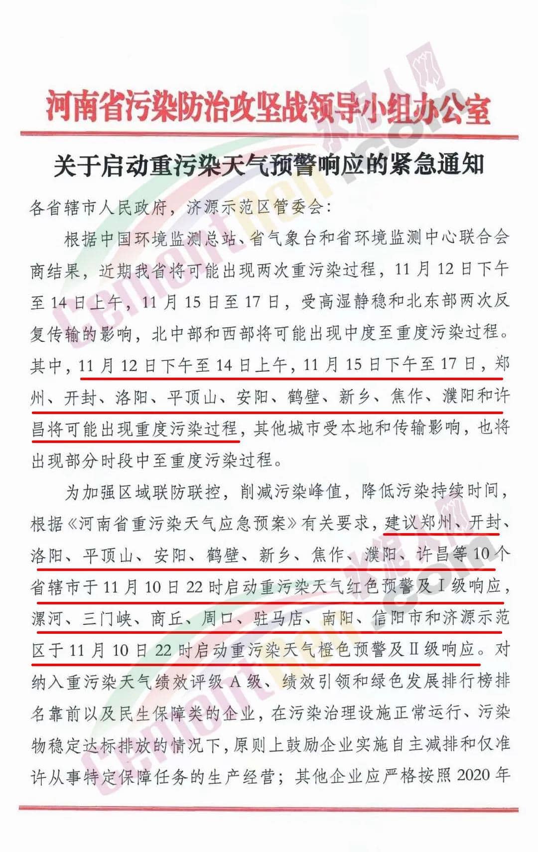 鄭州、開封、 洛陽、平頂山、安陽、鶴壁、新鄉(xiāng)、焦作、濮陽、許昌等10個省轄市于11月10日22時啟動重污染天氣紅色預(yù)警及I級響應(yīng)。漯河、三門峽、商丘、周口、駐馬店、南陽、信陽市和濟源示范區(qū)于11月10日22時啟動重污染天氣橙色預(yù)警及II級響應(yīng)。對納入重污染天氣績效評級A級、績效引領(lǐng)和綠色發(fā)展排行榜排 名靠前以及民生保障類的企業(yè),在污染治理設(shè)施正常運行、污染物穩(wěn)定達(dá)標(biāo)排放的情況下,原則上鼓勵企業(yè)實施自主減排和僅準(zhǔn)許從事特定保障任務(wù)的生產(chǎn)經(jīng)營;其他企業(yè)應(yīng)嚴(yán)格按照2020年重污染天氣應(yīng)急減排清單實施相應(yīng)級別管控措施。應(yīng)急搶險、重大民生工程和重點項目,在嚴(yán)格落實“六個百分之百”施工要求 的前提下,可正常施工。 重污染天氣預(yù)警期間,請各地重點加強對城市建成區(qū)及周邊排污企業(yè)的管控力度,對應(yīng)停未停、應(yīng)限不限、預(yù)警前故意抬高排放量及用電量,或借“出于安全考慮無法停下來” “設(shè)備調(diào)試、 檢修”名義規(guī)避管控的企業(yè)依法依規(guī)嚴(yán)格處理。各地要主動對社會發(fā)聲,提醒公眾做好健康防護措施,倡導(dǎo)公眾低碳生活、綠色消費,單位和公眾盡量減少含揮發(fā)性有機物的涂料、油漆、溶劑 等原材料和產(chǎn)品的使用,自覺接受社會監(jiān)督,同心協(xié)力做好重污 染天氣應(yīng)急應(yīng)對工作。通知原文如下: