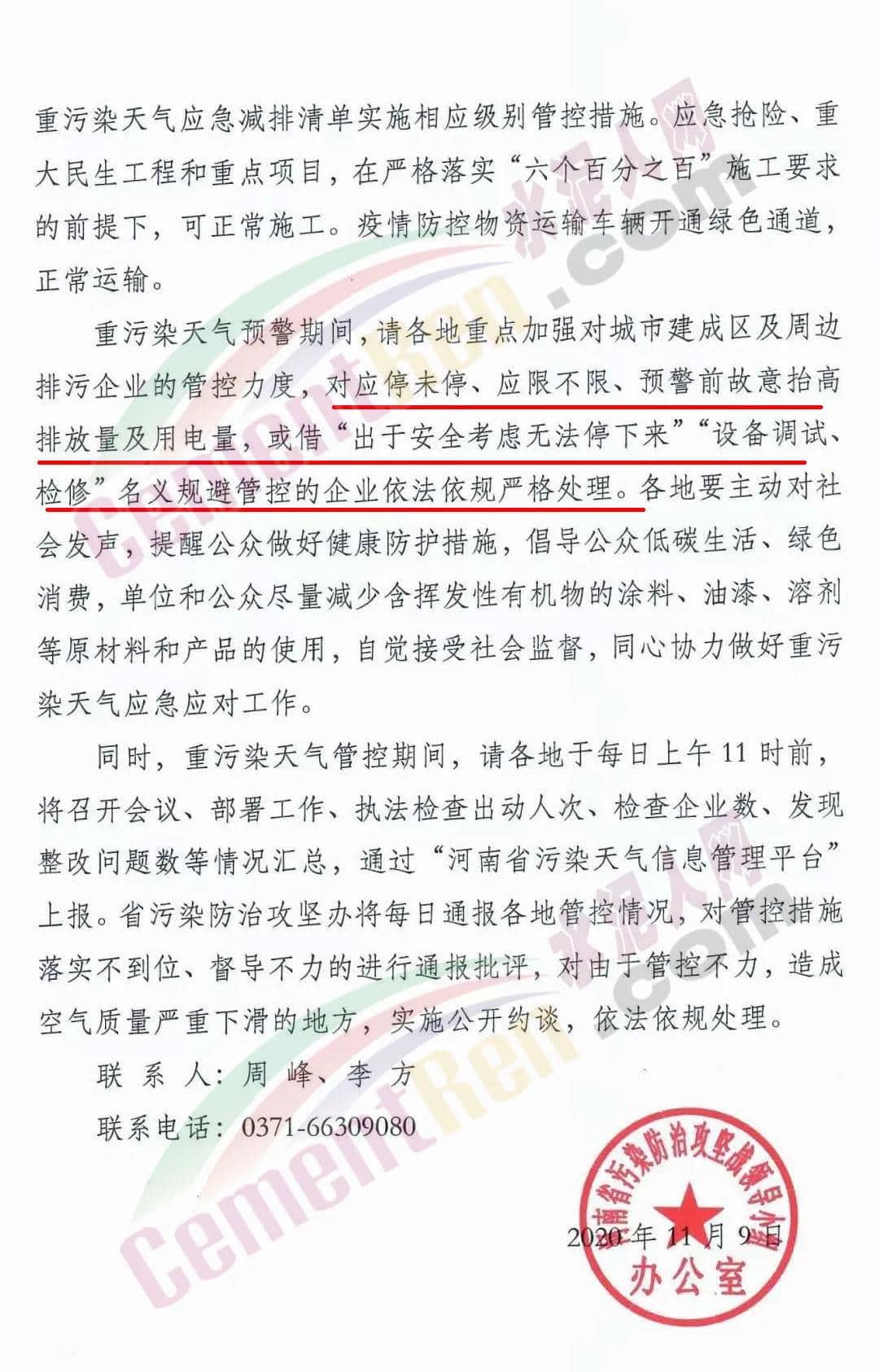1.11月10日至13日,全市水泥行業(yè)停產(chǎn);處于停爐狀態(tài)的工業(yè)企業(yè),未經(jīng)市生態(tài)環(huán)境局批準(zhǔn)不得擅自開爐;電廠排放量較11月8日排放量不得不降反升。