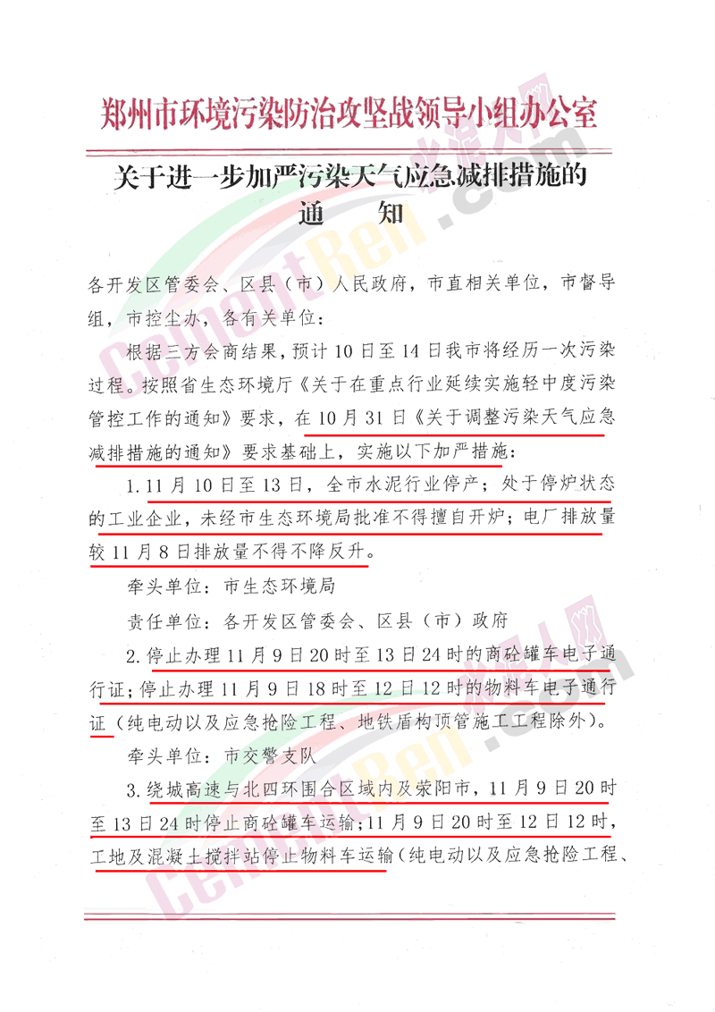 同日,鄭州市環(huán)境污染防治攻堅戰(zhàn)領(lǐng)導(dǎo)小組辦公室發(fā)布《關(guān)于進一步加嚴(yán)污染天氣應(yīng)急減排措施的通知》稱, 按照省生態(tài)環(huán)境廳《關(guān)于在重點行業(yè)延續(xù)實施輕中度污染管控工作的通知》要求,在10月31日《關(guān)于調(diào)整污染天氣應(yīng)急減排措施的通知》要求基礎(chǔ)上,實施加嚴(yán)措施: