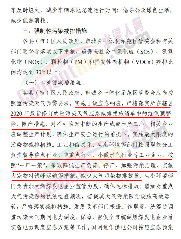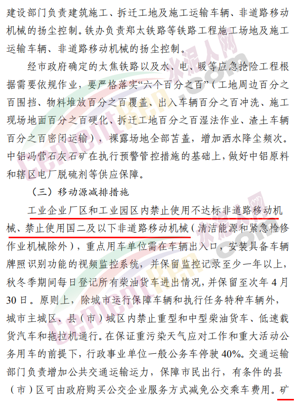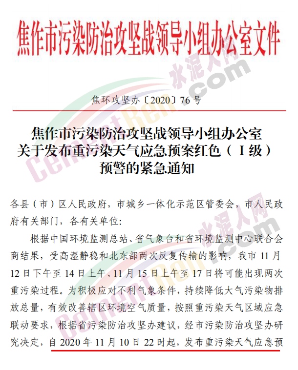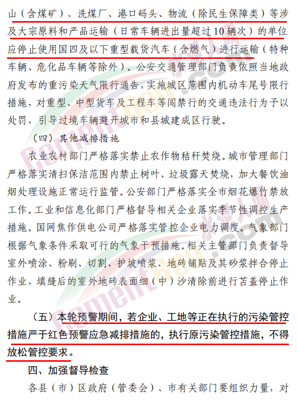焦作市污染防治攻堅戰(zhàn)領(lǐng)導(dǎo)小組辦公室發(fā)布《關(guān)于發(fā)布重污染天氣應(yīng)急預(yù)案紅色(Ⅰ級)預(yù)警的緊急通知》稱,根據(jù)省污染防治攻堅辦建議,經(jīng)焦作市污染防治攻堅辦研究決定,自 2020 年 11 月 10 日 22 時起,發(fā)布重污染天氣應(yīng)急預(yù)案紅色(Ⅰ級)預(yù)警,解除時間另行通知。各縣(市、區(qū))政府、 管委會及市有關(guān)部門要立即采取應(yīng)急減排措施。工業(yè)源減排措施方面要求各縣(市)區(qū)人民政府、市城鄉(xiāng)一體化示范區(qū)管委會應(yīng)當(dāng)按 照重污染天氣預(yù)警要求,實施Ⅰ級應(yīng)急響應(yīng),嚴(yán)格落實所在轄區(qū)2020 年最新修訂的重污染天氣應(yīng)急減排措施清單中的紅色預(yù)警停、限產(chǎn)措施。不可臨時中斷的生產(chǎn)線或生產(chǎn)工序,相關(guān)企業(yè)應(yīng)調(diào)整生產(chǎn)計劃,確保生產(chǎn)安全運行的前提下,實施最大限度的污染物減排措施。預(yù)警期間,嚴(yán)禁工業(yè)企業(yè)新開生產(chǎn)線或運行新的生產(chǎn)設(shè)備, 對于重污染天氣績效評級 A 級、績效引領(lǐng)、民生保障等企業(yè), 原則上鼓勵企業(yè)自主減排和僅準(zhǔn)許特定保障任務(wù)的生產(chǎn)經(jīng)營。長期停產(chǎn)及未建成企業(yè)復(fù)產(chǎn)或試生產(chǎn)前,須向縣(區(qū))、市兩級污染防治攻堅辦報告,經(jīng)同意后方可進行。揚塵源減排措施方面要求礦山、砂石料廠、石材廠、石板廠等應(yīng)停止露天作業(yè);施工工地停止室外作業(yè)。建筑垃圾清運車輛和砂石運輸車輛禁止上路行駛。開挖土石方的挖掘機等非道路移動機械停止作業(yè)。施工工地內(nèi)停止使用國二及以下非道路移動機械。移動源減排措施要求工業(yè)企業(yè)廠區(qū)和工業(yè)園區(qū)內(nèi)禁止使用不達(dá)標(biāo)非道路移動機械、禁止使用國二及以下非道路移動機械,重點用車單位需在車輛出入口,安裝具備車輛牌照識別功能的視頻監(jiān)控系統(tǒng),并保留監(jiān)控記錄至少一年以上, 秋冬季期間每日登記所有柴油貨車進出情況,并保留至次年4月30日。礦山(含煤礦)、洗煤廠、港口碼頭、物流等涉及大宗原料和產(chǎn)品運輸?shù)膯挝粦?yīng)停止使用國四及以下重型載貨汽車(含燃?xì)?進行運輸。本輪預(yù)警期間,若企業(yè)、工地等正在執(zhí)行的污染管控措施嚴(yán)于紅色預(yù)警應(yīng)急減排措施的,執(zhí)行原污染管控措施,不得放松管控要求。