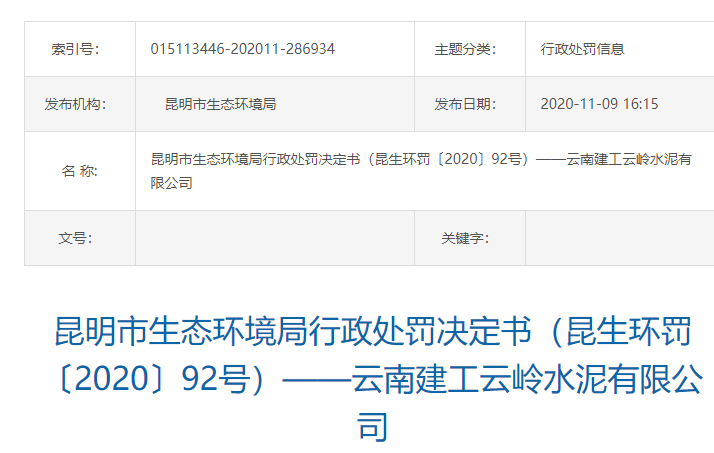 昆生環(huán)罰〔2020〕92號單位:云南建工云嶺水泥有限公司統(tǒng)一社會信用代碼:91530129676551443E法定代表人:馬敏超