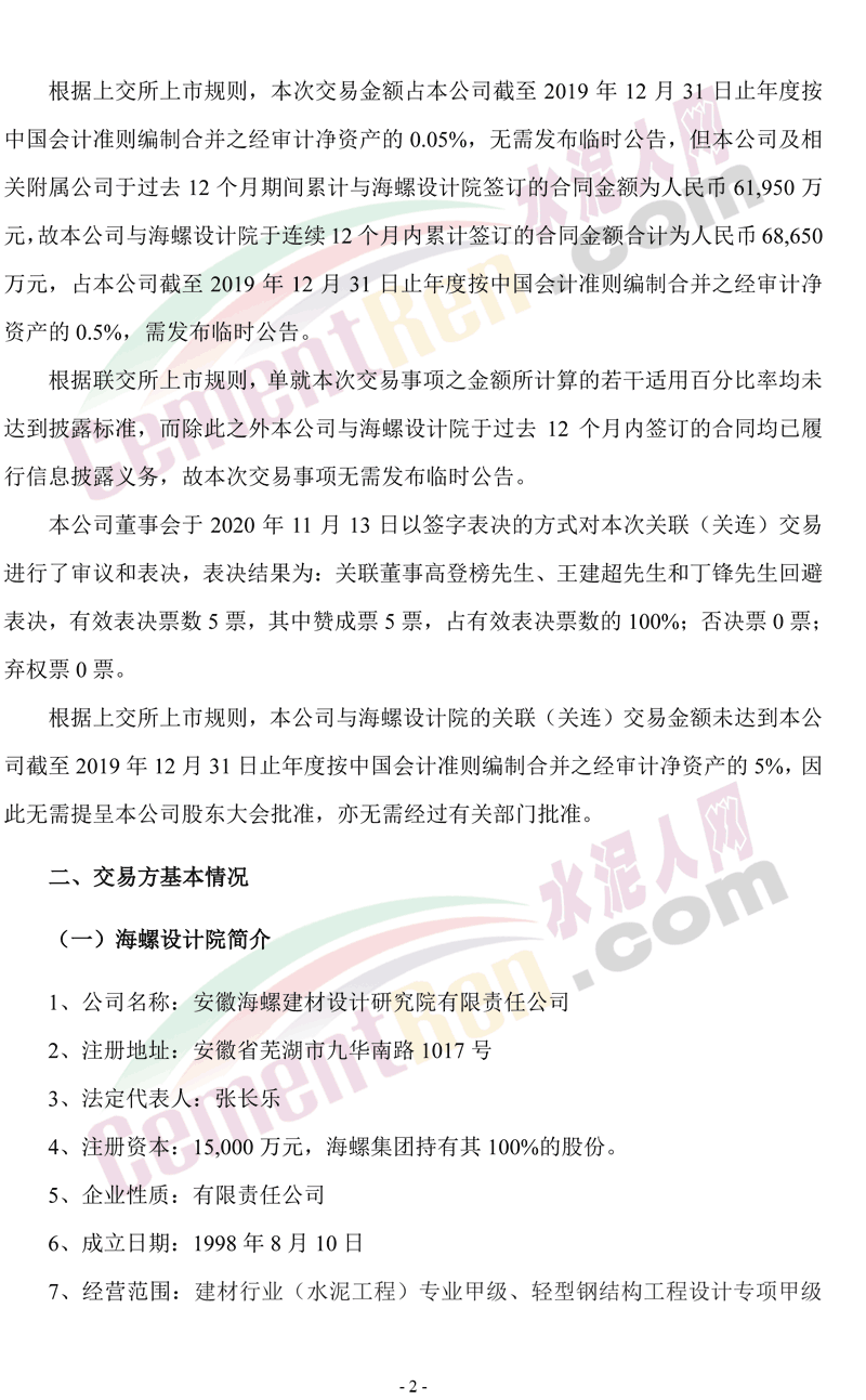 同日,公司下屬全資子公司銅陵海螺與海螺設(shè)計(jì)院簽署了《工程設(shè)計(jì)和設(shè)備采購及工程建設(shè)(EPC)總承包合同》,根據(jù)該合同,海螺設(shè)計(jì)院將為銅陵海螺2條熟料生產(chǎn)線SCR脫硝技術(shù)改造項(xiàng)目提供設(shè)備研發(fā)、工程設(shè)計(jì)、設(shè)備供貨、建筑安裝、工程監(jiān)理及工程管理等服務(wù),合同價(jià)格為人民幣4960萬元。上述兩項(xiàng)合同價(jià)格合計(jì)為人民幣45340萬元。公告原文如下: