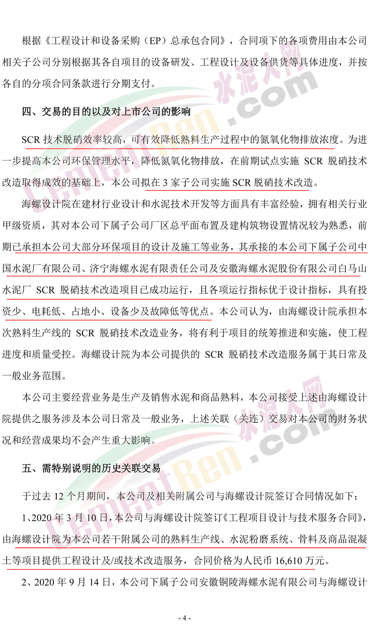 根據(jù)《工程設(shè)計(jì)和設(shè)備采購(EP)總承包合同》約定,海螺設(shè)計(jì)院將為公司3家子公司的5條熟料生產(chǎn)線的SCR脫硝技術(shù)改造項(xiàng)目提供設(shè)備研發(fā)、工程設(shè)計(jì)及設(shè)備供貨等服務(wù),合同金額合計(jì)為人民幣6,700萬元。公司相關(guān)子公司將分別與海螺設(shè)計(jì)院就彼等項(xiàng)目所接受的服務(wù)簽訂分項(xiàng)合同,該等分項(xiàng)合同的主要條款將與《工程設(shè)計(jì)和設(shè)備采購(EP)總承包合同》一致,且各分項(xiàng)合同項(xiàng)下的合同金額合計(jì)不超過《工程設(shè)計(jì)和設(shè)備采購(EP)總承包合同》的總合同價(jià)格。