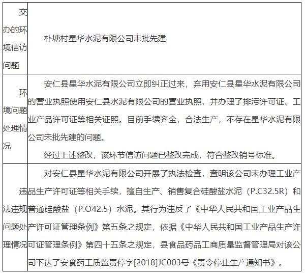 目前手續(xù)齊全,合法生產(chǎn),不存在星華水泥有限公司未批先建的問(wèn)題。經(jīng)過(guò)上述整改,該環(huán)節(jié)信訪問(wèn)題已整改完成,符合整改銷(xiāo)號(hào)標(biāo)準(zhǔn)。