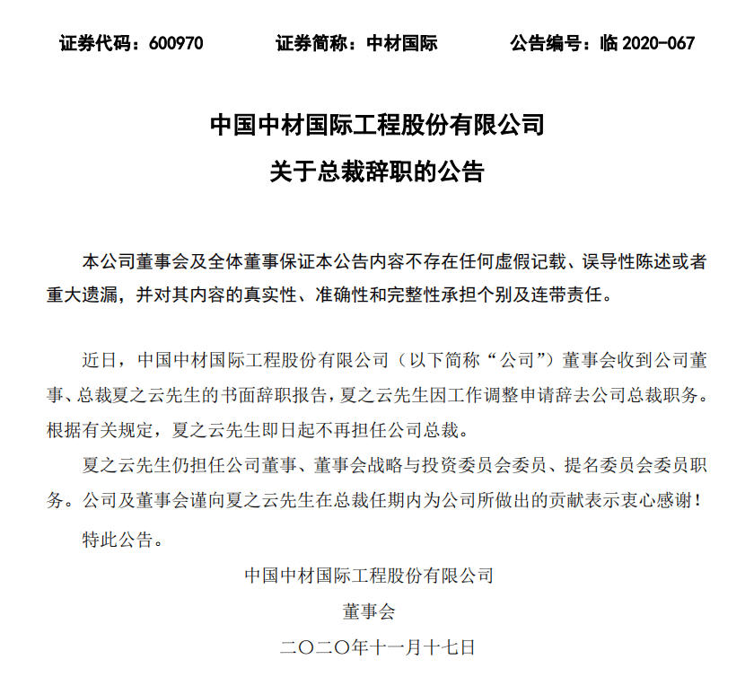 一、中國中材國際工程股份有限公司關(guān)于總裁辭職的公告