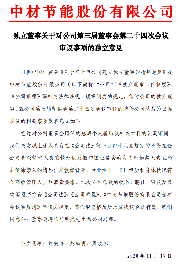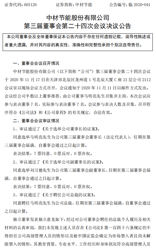 1、胡也明離職總裁職位,離職時間為2020年11月17日,離職原因為:工作變動。2、付貴平上任副總經(jīng)理職位,上任時間為2020年11月17日。3、馬明亮上任總裁職位,上任時間為2020年11月17日。中材節(jié)能股份有限公司是中材集團旗下從事余熱、余壓利用的余熱發(fā)電全方位服務(wù)商。中材節(jié)能致力于工業(yè)余熱、余壓的技術(shù)開發(fā)、綜合利用和產(chǎn)業(yè)化,擁有該領(lǐng)域及相關(guān)領(lǐng)域的設(shè)計、對外貿(mào)易經(jīng)營以及對外工程總承包等各類經(jīng)營資質(zhì),主要從事余熱發(fā)電項目的投資、技術(shù)開發(fā)、系統(tǒng)集成、工程設(shè)計、咨詢及工程總承包,提供清潔發(fā)展機制項目的開發(fā)方案及技術(shù)咨詢.中材節(jié)能也是經(jīng)國家商務(wù)部批準的承包境外低溫余熱發(fā)電系統(tǒng)工程和境內(nèi)國際招標(biāo)工程等業(yè)務(wù)的公司。
