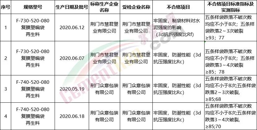 抽查結(jié)果顯示,水泥包裝。抽查全省29家企業(yè)生產(chǎn)的60批次水泥包裝袋,檢測發(fā)現(xiàn)4批次產(chǎn)品不合格,不合格發(fā)現(xiàn)率為6.67%。不合格項(xiàng)目為牢固度、防潮性,屬一般不合格。