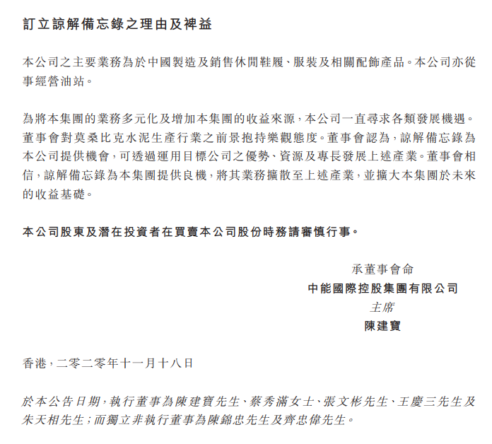 為將集團(tuán)的業(yè)務(wù)多元化及增加集團(tuán)的收益來(lái)源,公司一直尋求各類發(fā)展機(jī)遇。董事會(huì)對(duì)莫桑比克水泥生產(chǎn)行業(yè)的前景抱持樂(lè)觀態(tài)度。董事會(huì)認(rèn)為,諒解備忘錄為公司提供機(jī)會(huì),可透過(guò)運(yùn)用目標(biāo)公司的優(yōu)勢(shì)、資源及專長(zhǎng)發(fā)展上述產(chǎn)業(yè)。董事會(huì)相信,諒解備忘錄為集團(tuán)提供良機(jī),將其業(yè)務(wù)擴(kuò)散至上述產(chǎn)業(yè),并擴(kuò)大集團(tuán)于未來(lái)的收益基礎(chǔ)。
