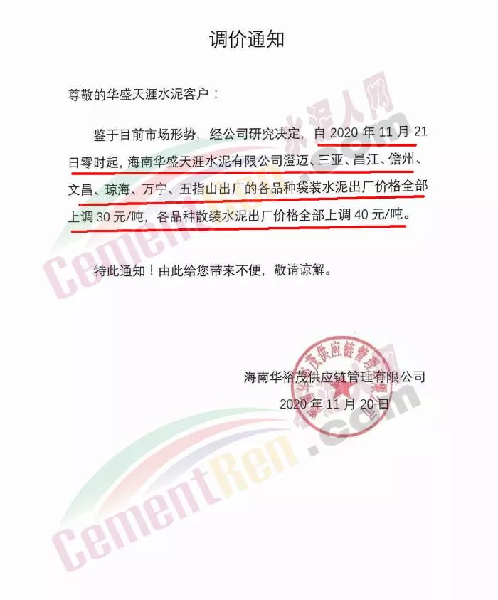 海南華盛天涯水泥有限公司調(diào)價通知稱,自2020年11月21日零時起,公司在澄邁、三亞、昌江、儋州、文昌、瓊海、萬寧、五指山出廠的各品種袋裝水泥出廠價格全部上調(diào)30元/噸,各品種散裝水泥出廠價格全部上調(diào)40元/噸。
