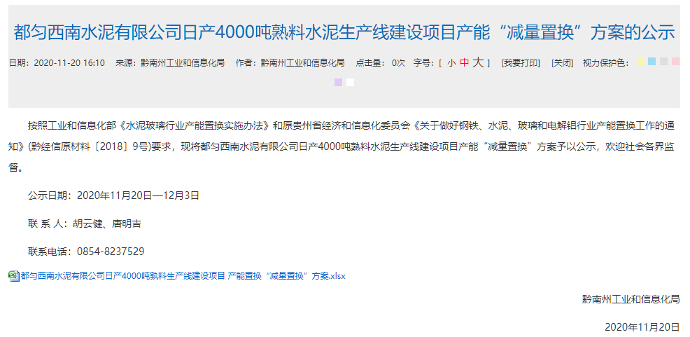 日前,貴州省黔南布依族苗族自治州工業(yè)和信息化局官網(wǎng)發(fā)布《都勻西南水泥有限公司日產(chǎn)4000噸熟料水泥生產(chǎn)線建設(shè)項(xiàng)目產(chǎn)能“減量置換”方案的公示》 。公示顯示,都勻西南水泥有限公司將通過退出貴州中誠水泥有限公司和貴州三都西南水泥有限公司兩條2500t/d熟料生產(chǎn)線,新建一條4000t/d新型干法熟料生產(chǎn)線。