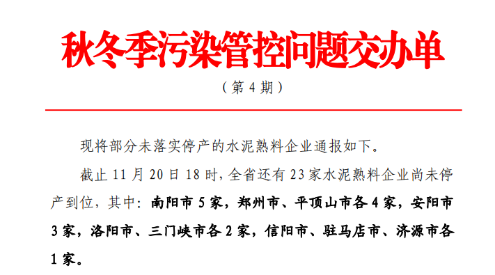 據(jù)當(dāng)?shù)赝▓?bào)文件,截止 11 月 20 日 18 時(shí),全省還有 23 家水泥熟料企業(yè)尚未停產(chǎn)到位,其中:南陽(yáng)市 5 家,鄭州市、平頂山市各 4 家,安陽(yáng)市3 家,洛陽(yáng)市、三門峽市各 2 家,信陽(yáng)市、駐馬店市、濟(jì)源市各1 家。