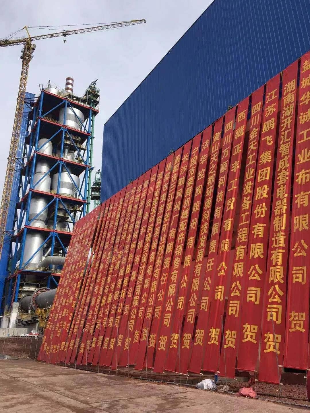在新項目點火儀式現(xiàn)場,掛滿了成都利君實業(yè)、鹽城華誠、湖南湖開匯智成套電器、江蘇鵬飛、四川金天工業(yè)設(shè)備、西藏正豐工貿(mào)等公司的祝賀條幅,現(xiàn)場工人們在做點火前的準備工作。