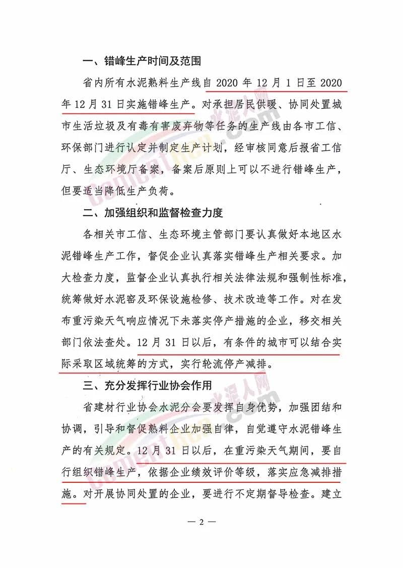 省內(nèi)所有水泥熟料生產(chǎn)線自2020年12月1日至2020年12月31日實施錯峰生產(chǎn)。對承擔(dān)居民供暖、協(xié)同處置城市生活垃圾及有毒有害廢棄物等任務(wù)的生產(chǎn)線由各市工信、環(huán)保部門進行認定并制定生產(chǎn)計劃,經(jīng)審核同意后報省工信廳、生態(tài)環(huán)境廳備案,備案后原則上可以不進行錯峰生產(chǎn),但要適當降低生產(chǎn)負荷。