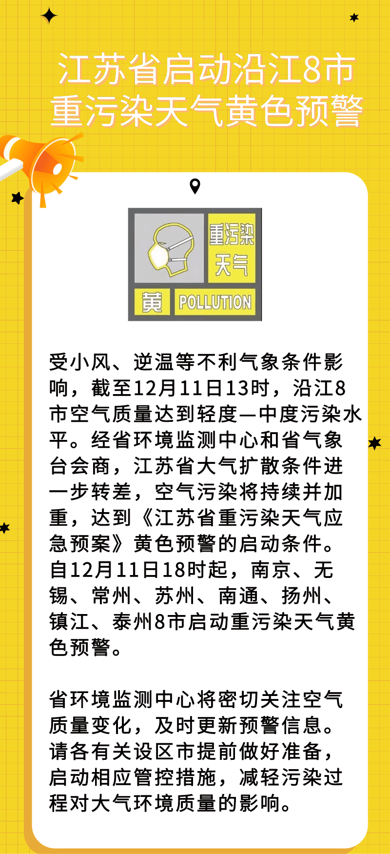 受小風(fēng)、逆溫等不利氣象條件影響,截至12月11日13時,沿江8市空氣質(zhì)量達(dá)到輕度-中度污染水平。經(jīng)省環(huán)境監(jiān)測中心和省氣象臺會商,江蘇省大氣擴散條件進(jìn)一步轉(zhuǎn)差,空氣污染將持續(xù)并加重,達(dá)到《江蘇省重污染天氣應(yīng)急預(yù)案》黃色預(yù)警的啟動條件。自12月11日18時起,南京、無錫、常州、蘇州、南通、揚州、鎮(zhèn)江、泰州8市啟動重污染天氣黃色預(yù)警。