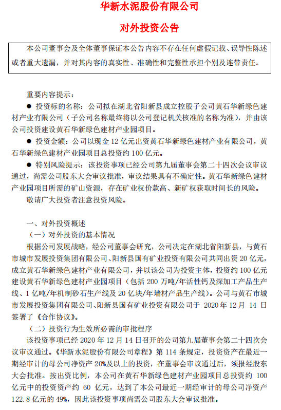 按出資比例,公司在黃石華新綠色建材產(chǎn)業(yè)園項目總投資約100億元中的投資資產(chǎn)約60億元,達(dá)到了公司最近一期經(jīng)審計的母公司凈資產(chǎn)122.8億元的49%,因此該投資事項尚需公司股東大會審議批準(zhǔn)。