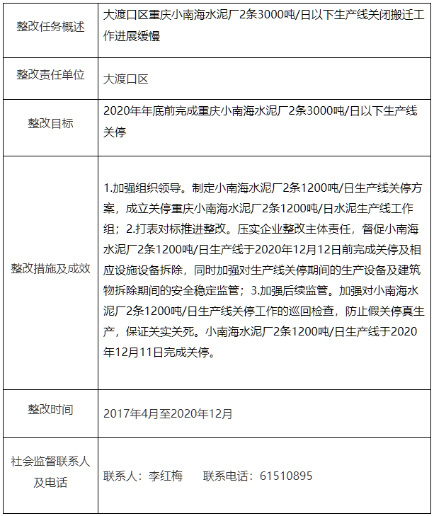 日前,重慶市大渡口區(qū)生態(tài)環(huán)境局,重慶小南海水泥廠2條1200噸日生產(chǎn)線整改銷號情況公示表。其中整改措施及成效一項顯示: 此次整改措施包括制定小南海水泥廠2條1200噸/日生產(chǎn)線關停方案,成立關停重慶小南海水泥廠2條1200噸/日水泥生產(chǎn)線工作組;打表對標推進整改。壓實企業(yè)整改主體責任,督促小南海水泥廠2條1200噸/日生產(chǎn)線于2020年12月12日前完成關停及相應設施設備拆除,同時加強對生產(chǎn)線關停期間的生產(chǎn)設備及建筑物拆除期間的安全穩(wěn)定監(jiān)管;加強后續(xù)監(jiān)管。加強對小南海水泥廠2條1200噸/日生產(chǎn)線關停工作的巡回檢查,防止假關停真生產(chǎn),保證關實關死。小南海水泥廠2條1200噸/日生產(chǎn)線于2020年12月11日完成關停。