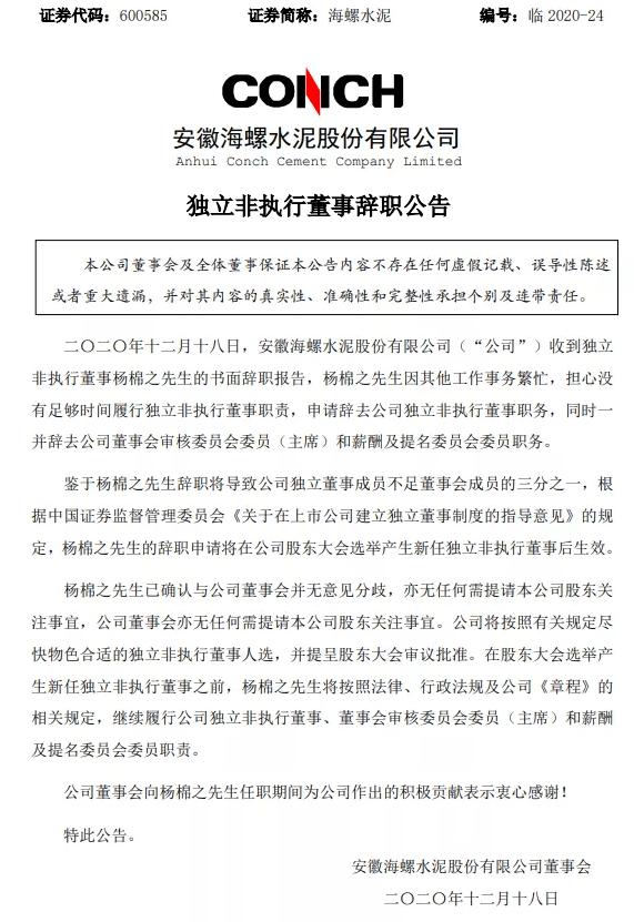 日前,海螺水泥(00914.HK)宣布,公司在2020年12月18日收到獨(dú)立非執(zhí)行董事楊棉之提出的書面辭職申請(qǐng)。